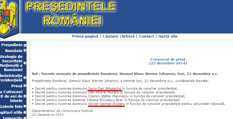 Primul decret semnat de președintele Iohannis vizează numirea în funcția de consilier prezidențial a domnului Sorin-Dan Mihalache. Se pare că domnul Sorin-Dan Mihalache va fi și șeful cancelariei prezidențiale.