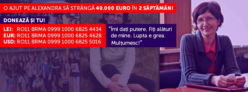 Vă invit să vă alăturați campaniei lansate de colegii, elevii, prietenii și susținătorii Alexandrei, donând o sumă de bani în conturile deschise.