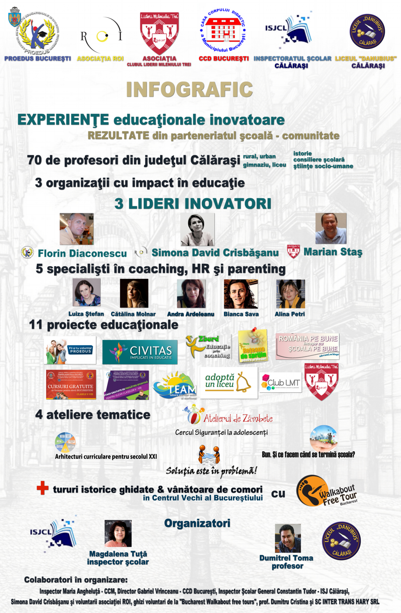 Evenimentul este organizat de Inspector Magdalena Tuță și profesor Dumitrel Toma, cu susținerea colaboratorilor: Inspector Maria Angheluţă – CCM, Director Gheorghe Vîlceanu – CCD Bucureşti, Inspector Şcolar General Constantin Tudor – ISJ Călăraşi, Simona David Crisbăşanu şi voluntarii asociaţiei ROI, ghizi voluntari de la Bucharest Walkabout free tours, prof. Dumitru Cristina şi SC INTER TRANS HARY SRL