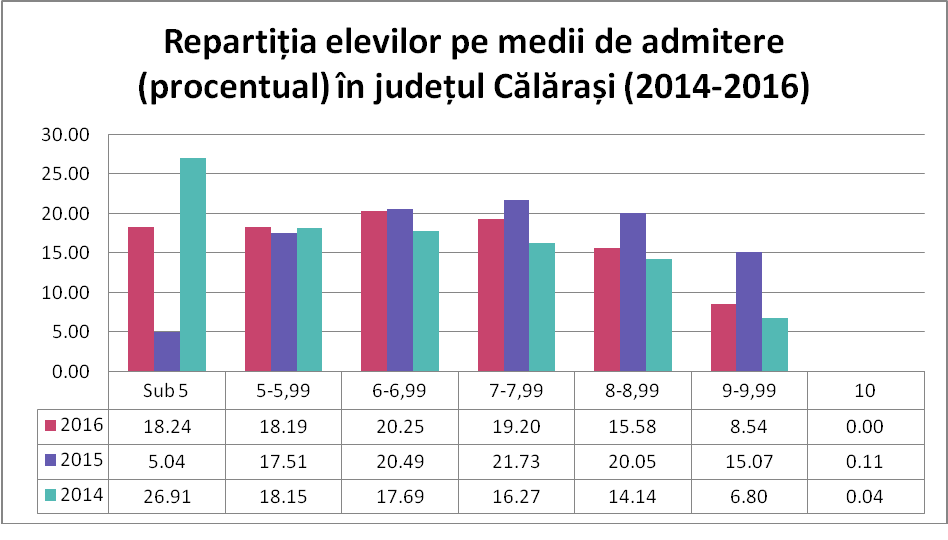 Datele publicate online pentru județul Călărași, permit comparații între mediile de admitere ale elevilor în anii 2014, 2015, 2016 (metoda de calcul fiind identică), dar și analize ale rezultatelor la Evaluarea Națională din 2016.