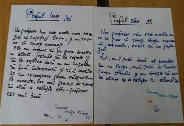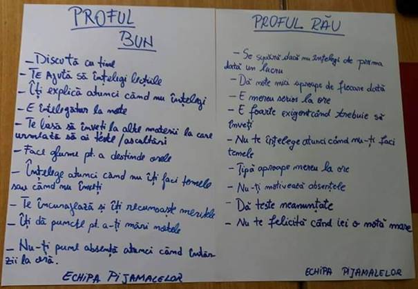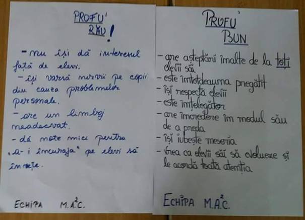 Tema activității, “profesorul bun vs profesorul rău”. Din nefericire, subiectul se întâlnește rar în agenda educației formale, o evalure a profesorilor de către beneficiari, părinți sau elevi, a fost constant blocată și subminată chiar de profesori, însă profesorii care nu se tem de percepțiile elevilor au libertatea ca în cadrul programului „Școala altfel” să abordeze și teme tabu. Cât de tabu ar putea fi tema evaluării cadrelor didactice, cât timp totul se decide în funcție de ea: concurența la licee, rezultatele școlare, piața meditațiilor, premiile la olimpiade, atractivitatea mediului școlar, decideți dumneavoastră.