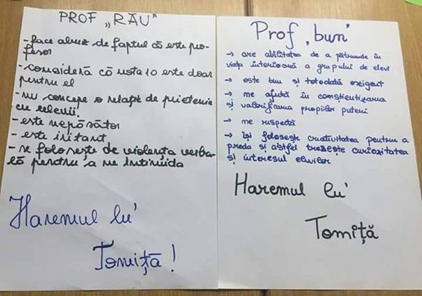 Nu există nimic supărător în aceste materiale, exceptând multe din descrierile profesorului rău, care, fie “țipă întotdeauna la ore”, fie „se supără dacă nu înțelegi de prima dată un lucru” (după părerea membrilor echipei Pijamalele), fie „consideră că nota 10 este doar pentru el”, fie „se folosește de violența verbală pentru a intimida” (după părerea membrilor echipei Haremul lui Tomiță!), fie „știe să jignească”, fie „întârzie la ore” (după cum reiese din textul echipei Pisicile albastre de Rusia), și exemplele ar putea continua.