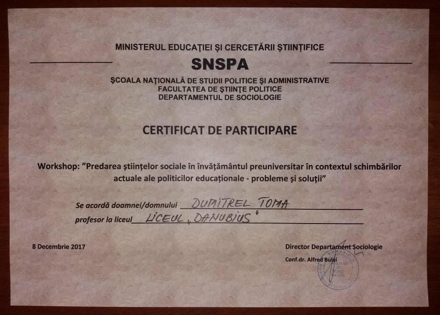 În data de 8 decembrie 2017, conducerea Departamenului de Sociologie din cadrul Facultății de Științe Politice a Școlii Naționale de Științe Politice și Administrative (SNSPA), a inițiat un workshop cu profesori de liceu care predau sociologie și științe sociale. Din partea departamentului au participat conf. dr. Alfred Bulai – Directorul Departamentului de Sociologie, prof. univ. dr. Vintilă Mihăilescu, lector univ. dr. Roxana Cuciumeanu, lector univ. dr. Bogdan Iancu, lector univ. dr. Aurelian Muntean.