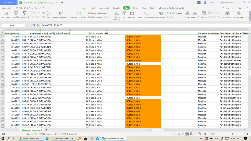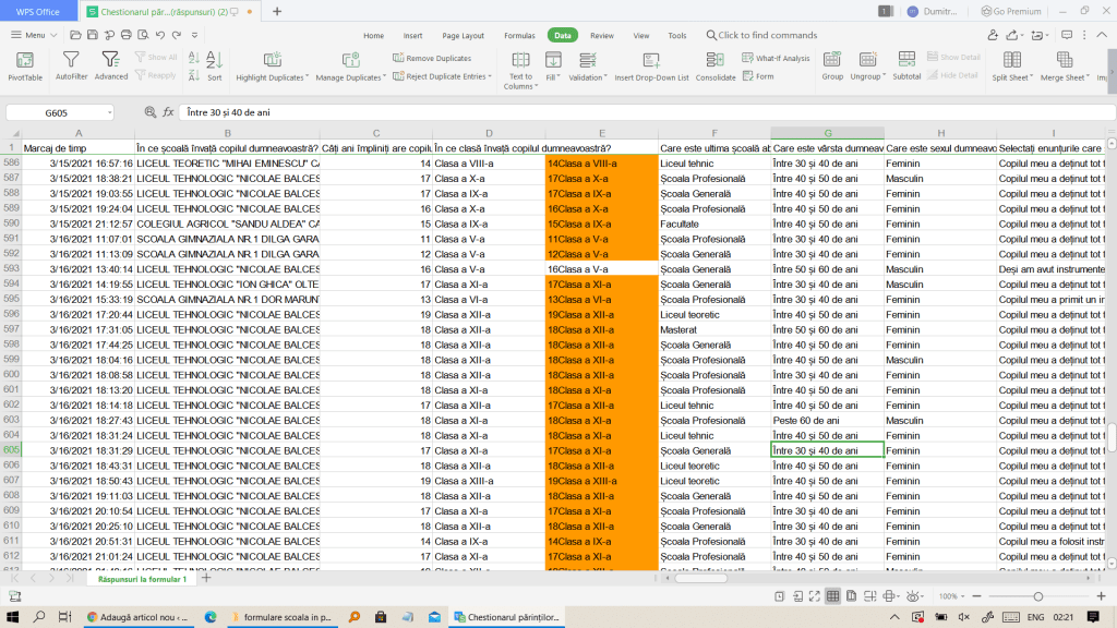 2. Căutăm înregistrările inconsistente. Concatenăm câmpurile vârstelor și claselor, ale claselor și ale tipurilor de școli, identificând înregistrările excentrice. Eliminăm elevii care depășesc cu 3 ani vârsta clasei și pe cei care studiază în școli gimnaziale dar și-au declarat apartenența la clase mai mari de a VIII-a. După eliminarea înregistrărilor inconsistente, au rămas 2245 de răspunsuri.