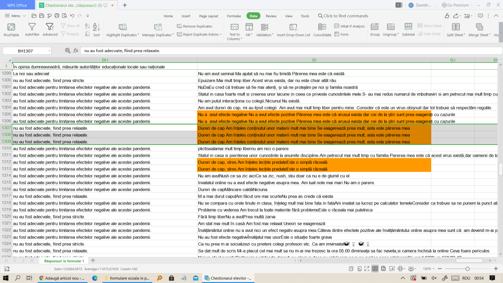 1. Mai întâi, căutăm dublurile. Iar înregistrările care se repetă le identificăm concatenând trei câmpuri cu întrebări deschide. Dacă rezultatele sunt identice, înseamnă că formularul a fost transmis identic în mod repetat. După eliminarea dublurilor, au rămas 217 răspunsuri.